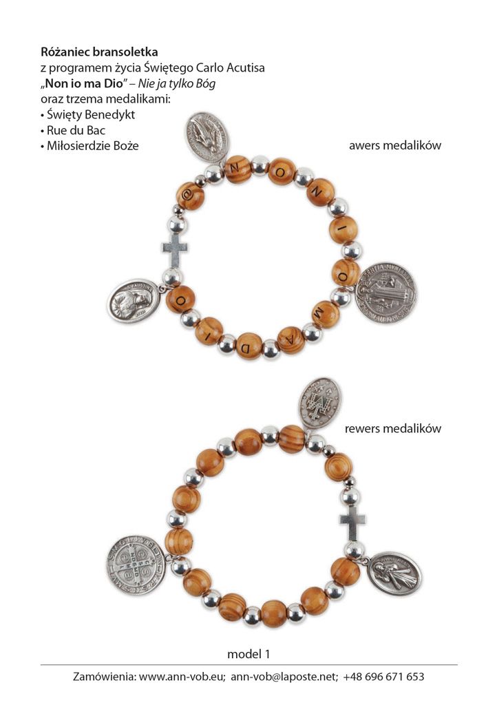 Bransoletka-Różaniec „NON IO MA DIO” z trzema medalikami: Święty Benedykt; Rue du Bac; Miłosierdzie Boże.