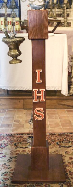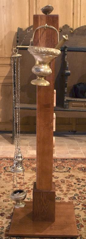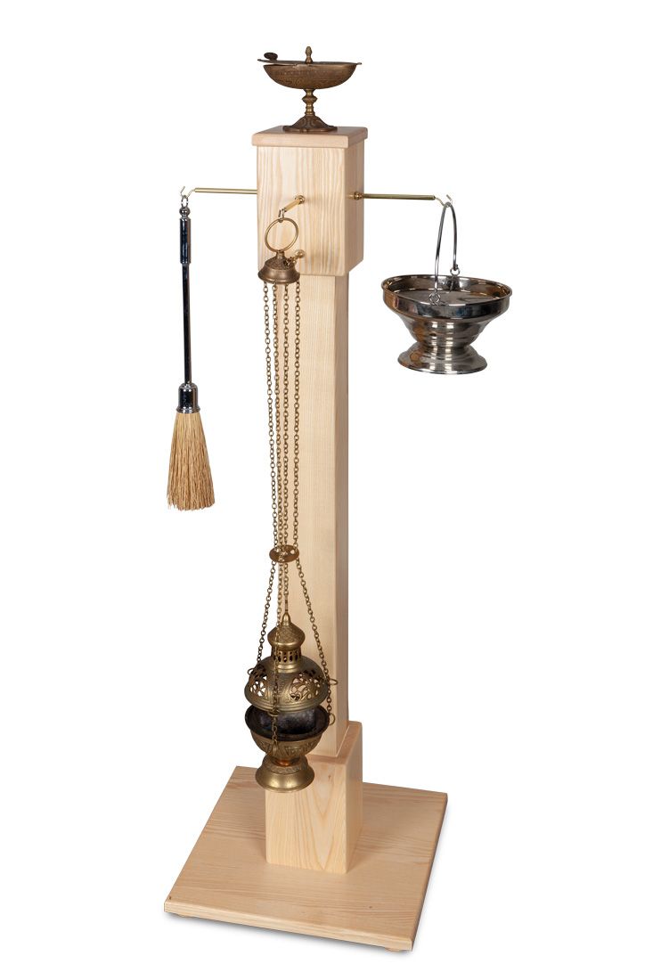 Wys. – 125 cm; podstawa – 40 x 40 cm. Kropidło; kociołek z woda święcona; turybularz; łódka z kadzidłem.