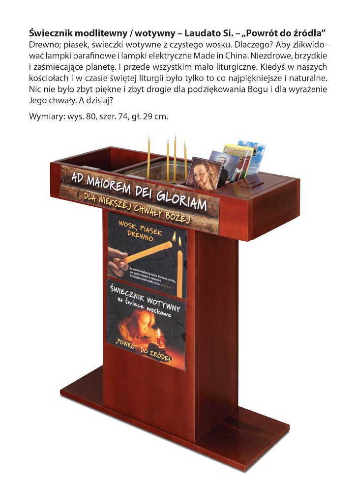 2) Lumen Christi – propozycja będącą „heroiczną” próbą (Dawid przeciwko Goliatowi) powrotu do naturalnych produktów w liturgii (wosk, drewno, oliwa)
